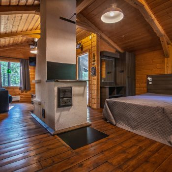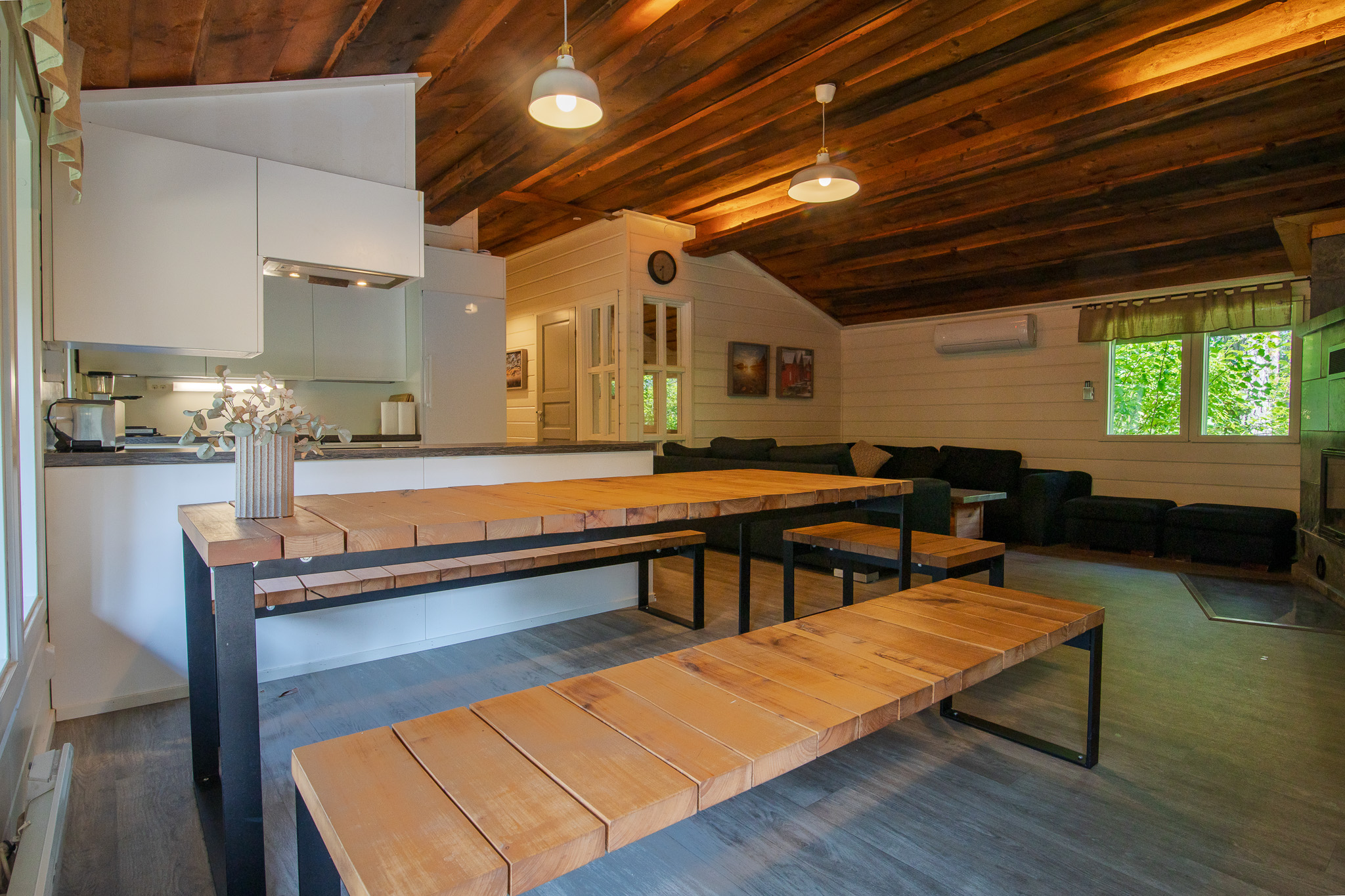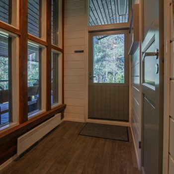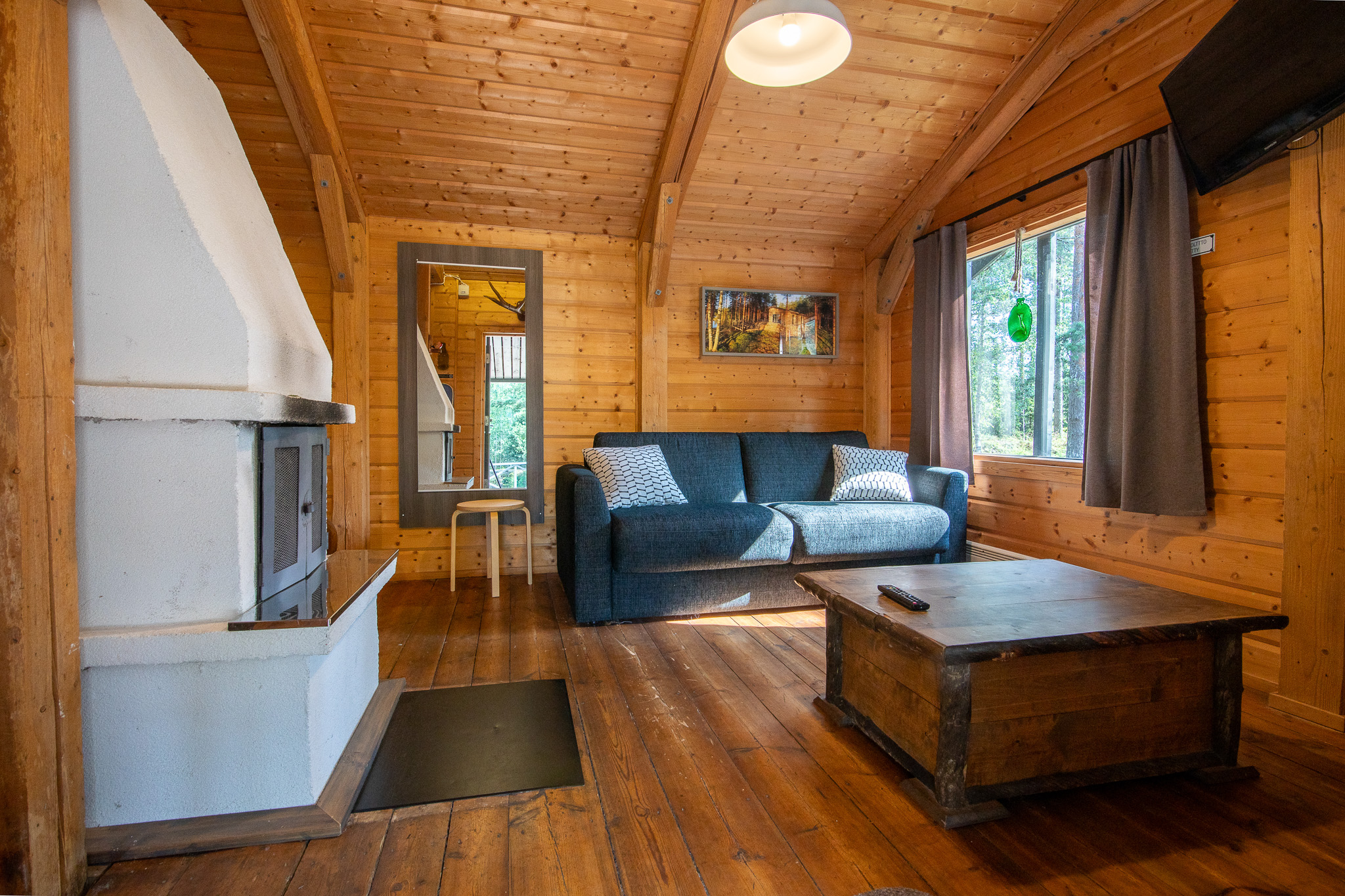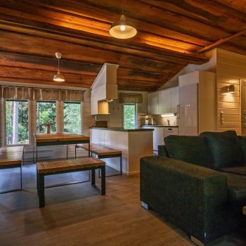 Päärakennuksen oleskelutila jossa on divaanisohva, pöytä, kolme pientä istuinta ja 50″ tv. Päärakennuksessa on ilmalämpöpumppu ja ilmainen wifi. Vierasmökissä on pieni oleskelutila jossa on vuodesohva, pöytä ja 32″ tv. Myös vierasmökissä on wifi.