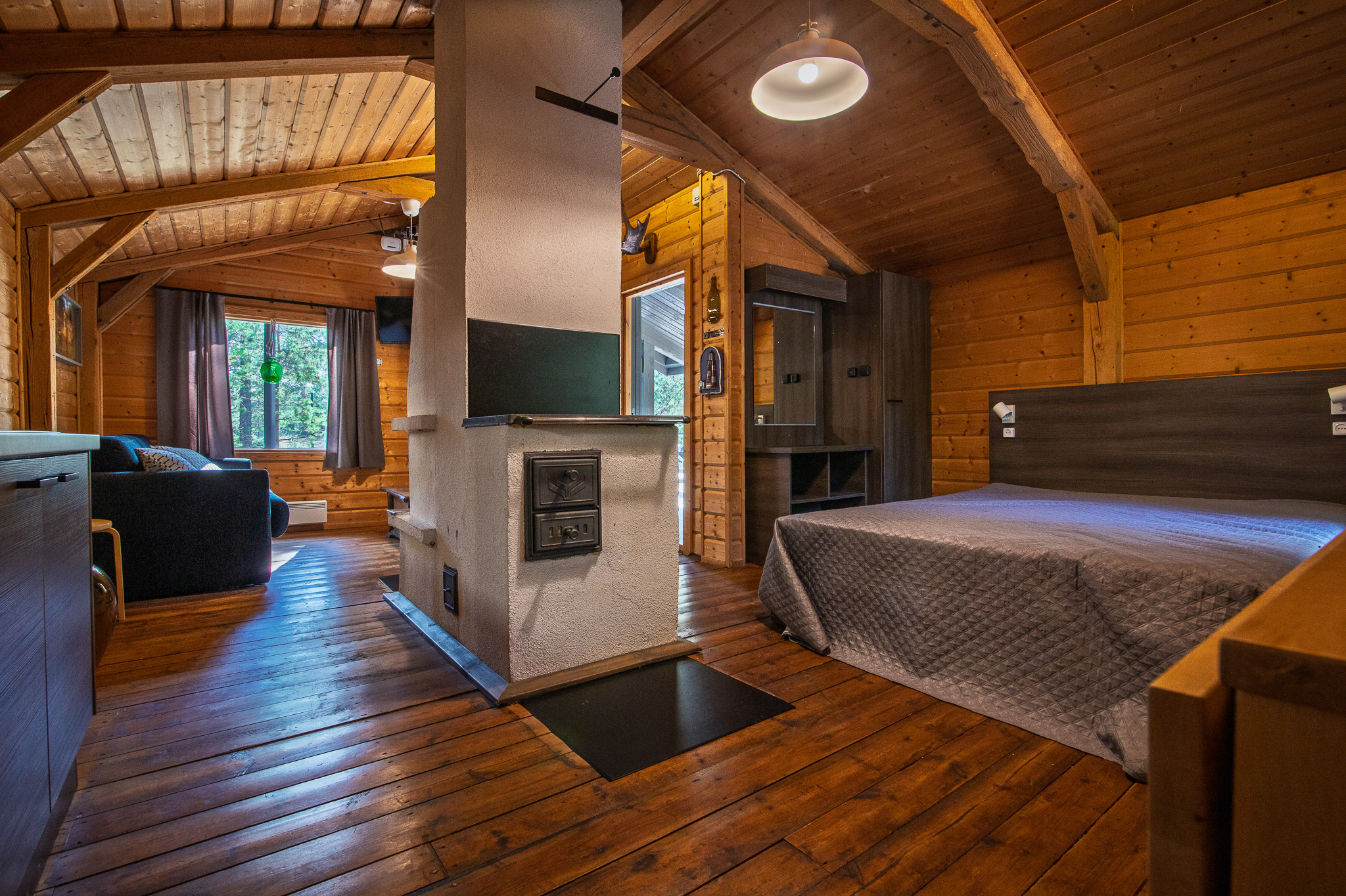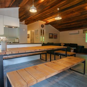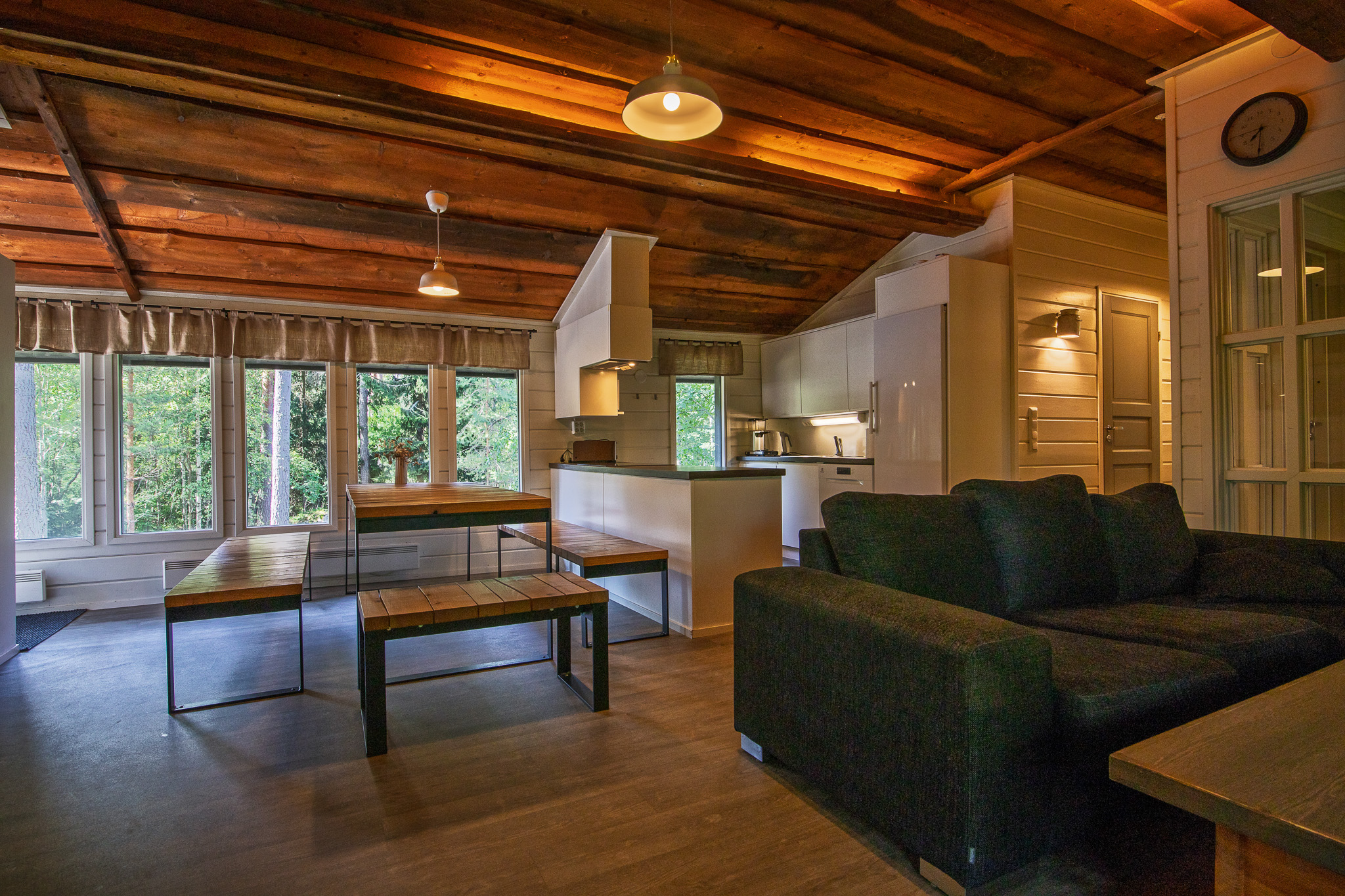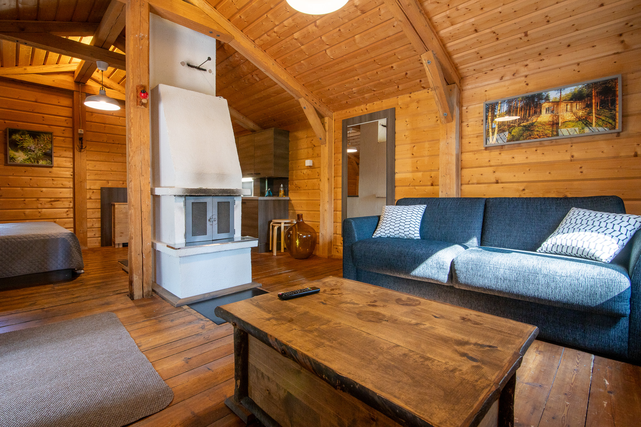 Päärakennuksen oleskelutila jossa on divaanisohva, pöytä, kolme pientä istuinta ja 50″ tv. Päärakennuksessa on ilmalämpöpumppu ja ilmainen wifi. Vierasmökissä on pieni oleskelutila jossa on vuodesohva, pöytä ja 32″ tv. Myös vierasmökissä on wifi.