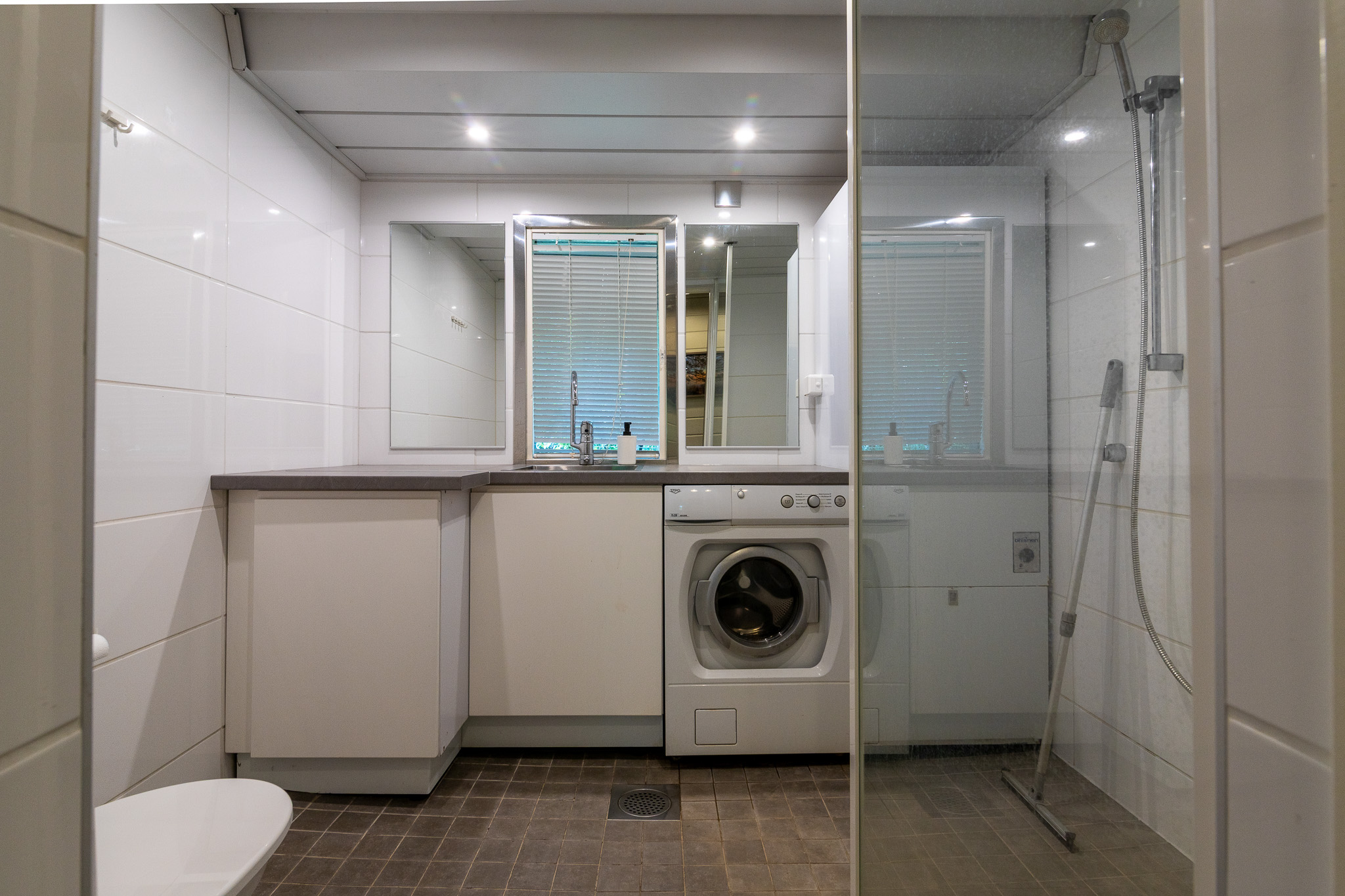 Päärakennuksessa on pesuhuone jossa yksi wc, suihku ja käsienpesuallas. Samassa tilassa myös pyykinpesukone.