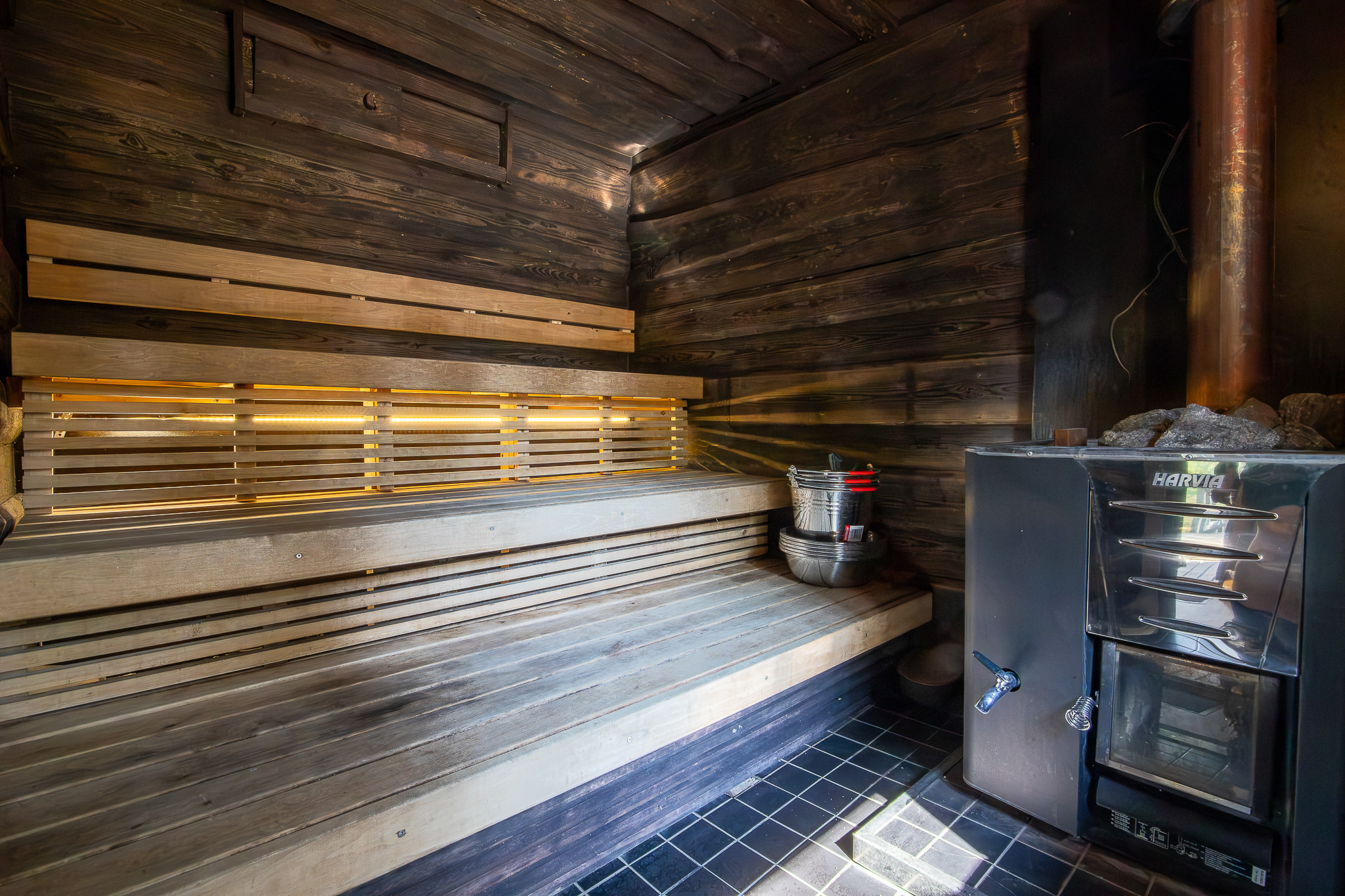 Lammen rannassa on rantasauna jossa puutoiminen kiuas. Saunaan mahtuu 6-10 henkeä kerrallaan. Sauna on perinteinen pesusauna jossa peseydytään samassa tilassa. Saunassa myös pieni pukuhuone. Kiuas Harvia jossa lämmitettävä vesisäiliö. Vesi tulee porakaivosta.