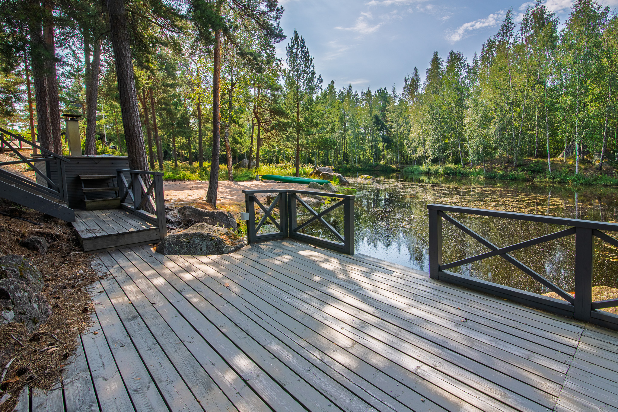 Lammessa voit myös meloa kajakilla joka löytyy saunan edustalla olevalta hiekkarannalta.
